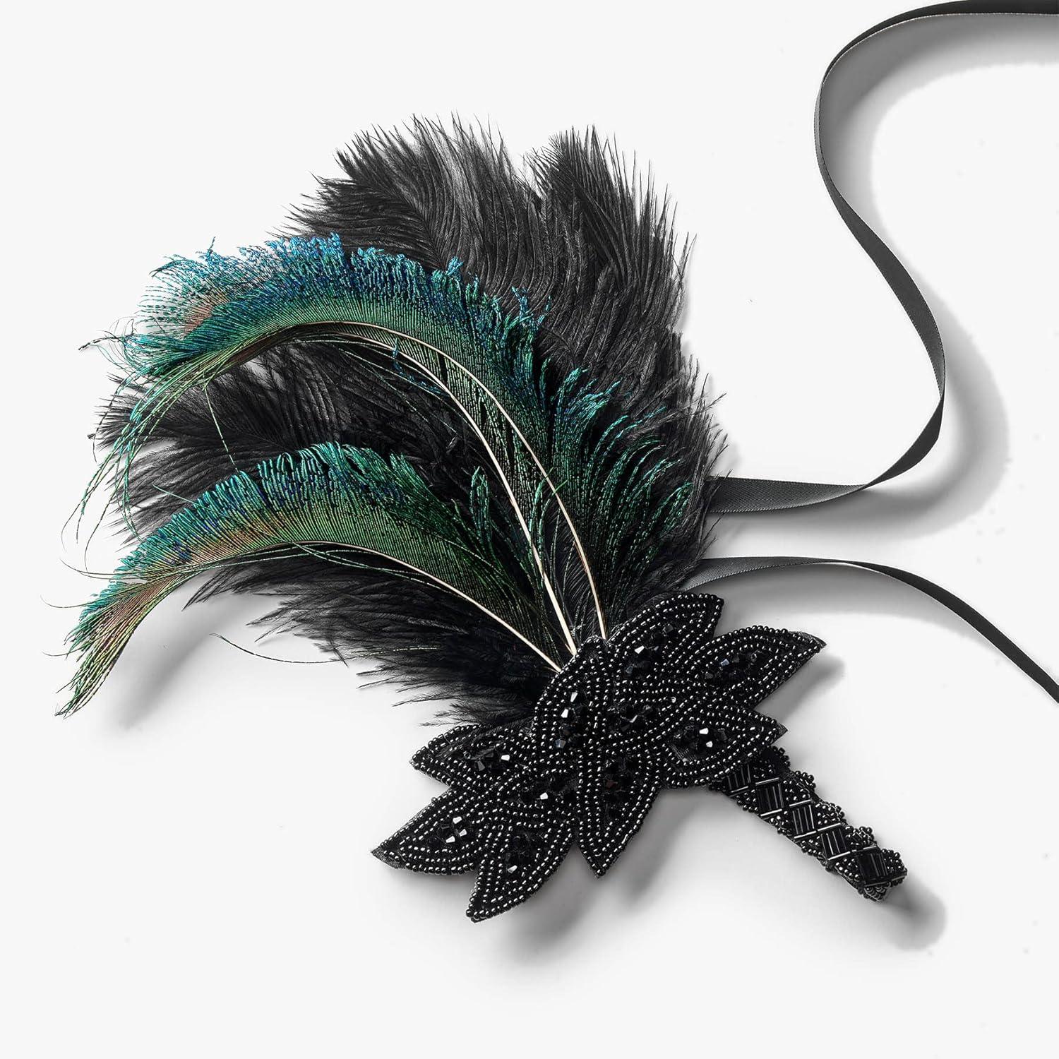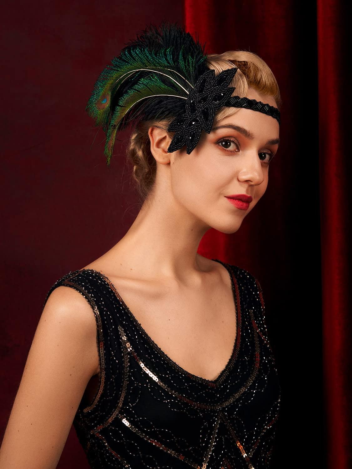 SWEETV 1920s Flapper Feather Headband, 20s Sequined Showgirl Headpiece, Gatsby Hair Accessories for Women (0.1 Black)(0.2 Black)