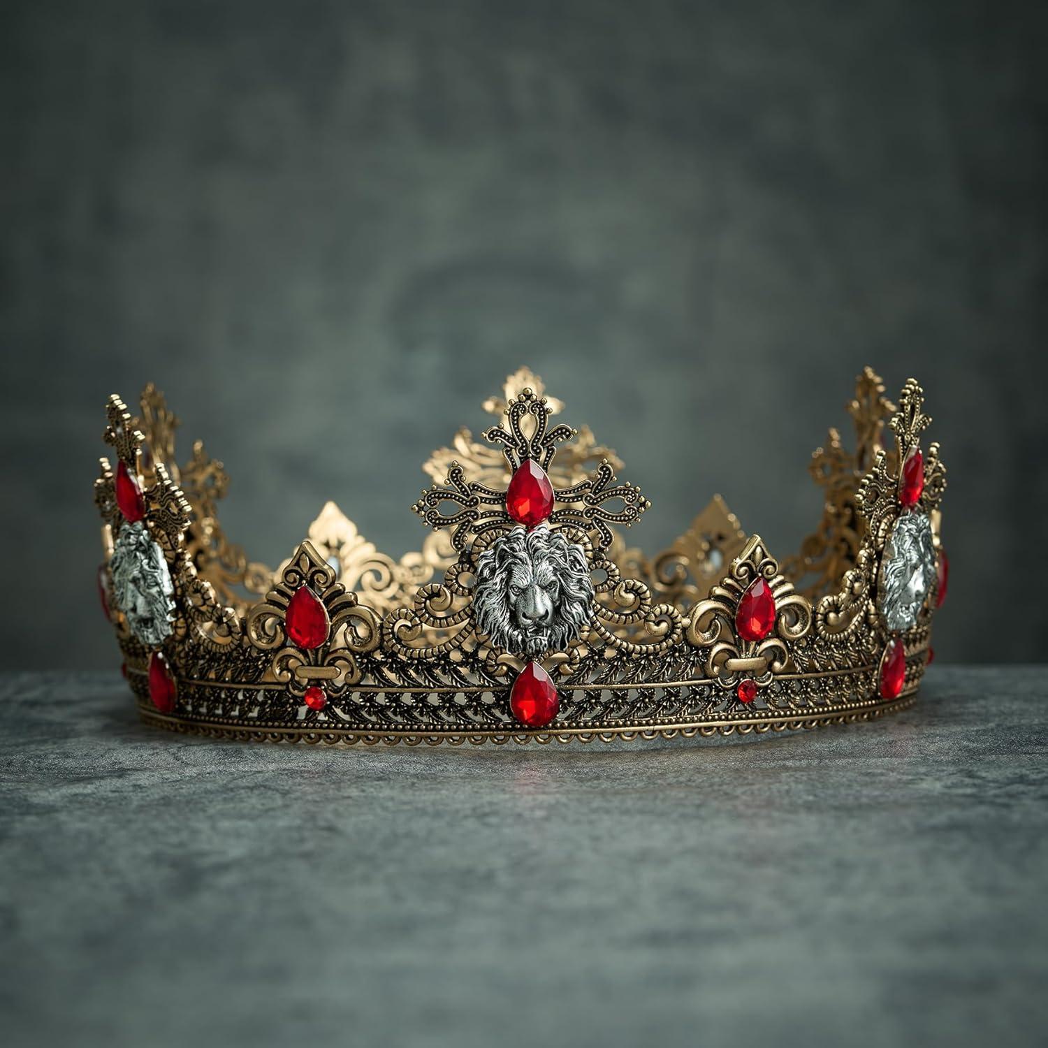 SWEETV Animal Totem King Crown for Men and Women, Lion Crown, Medieval Metal Tiara Costume Hair Accessories for Knight, Witch, Gothic, Viking, Halloween, Lion/Antique Gold Red