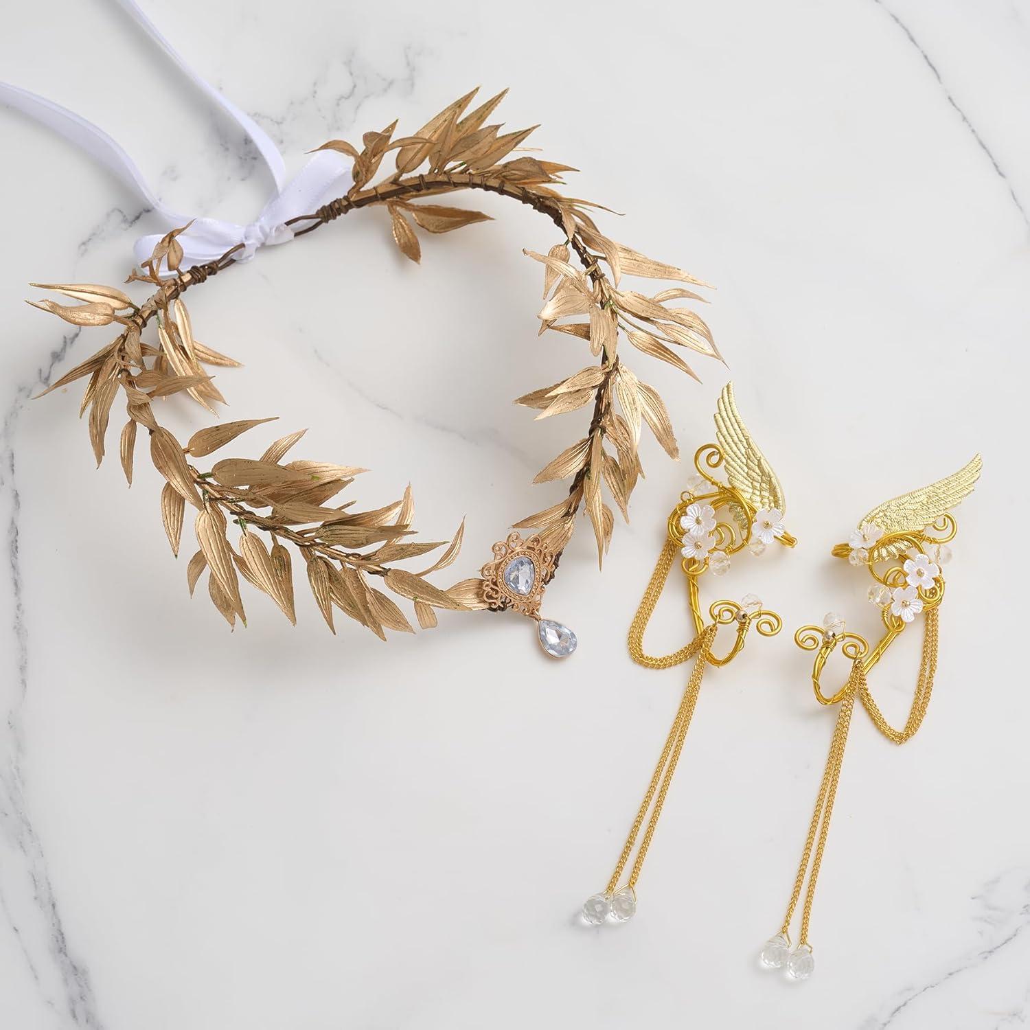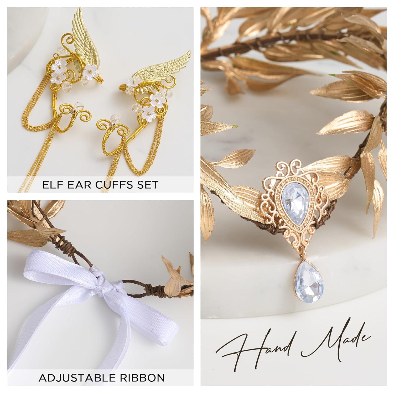 imageSWEETV Fairy Flower Hairband with Elf Ears Halloween Fairy Headpiece for Women Leaf Elf Circlet with Wings Cuff Earrings Leaf Hairband Set for Photoshoot Cosplay Party GoldLeafB one sizeGoldLeafD