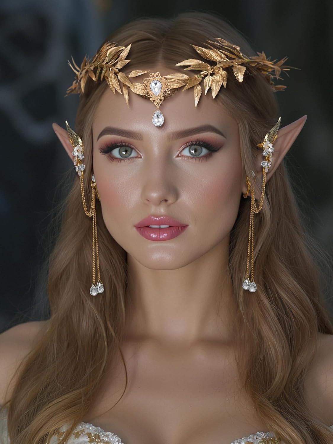 ♠Package : The Renaissance crown elf ears set includes 1 woodland headdress rhinestone pendant crown and 1 pair of elf wing ear cuffs, a nice combination for you to use in parties and events.