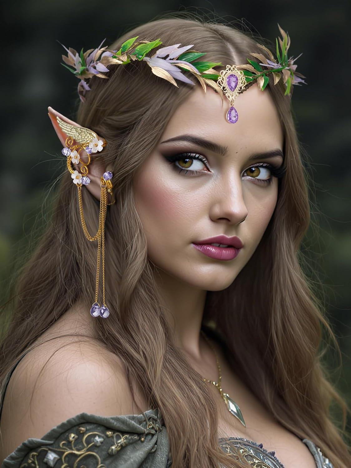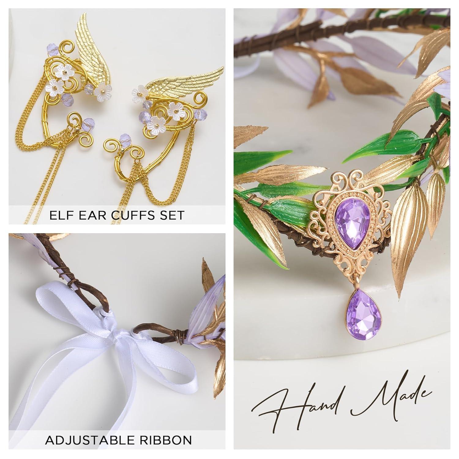 imageSWEETV Fairy Flower Hairband with Elf Ears Halloween Fairy Headpiece for Women Leaf Elf Circlet with Wings Cuff Earrings Leaf Hairband Set for Photoshoot Cosplay Party GoldLeafB one sizePurpleLeafA