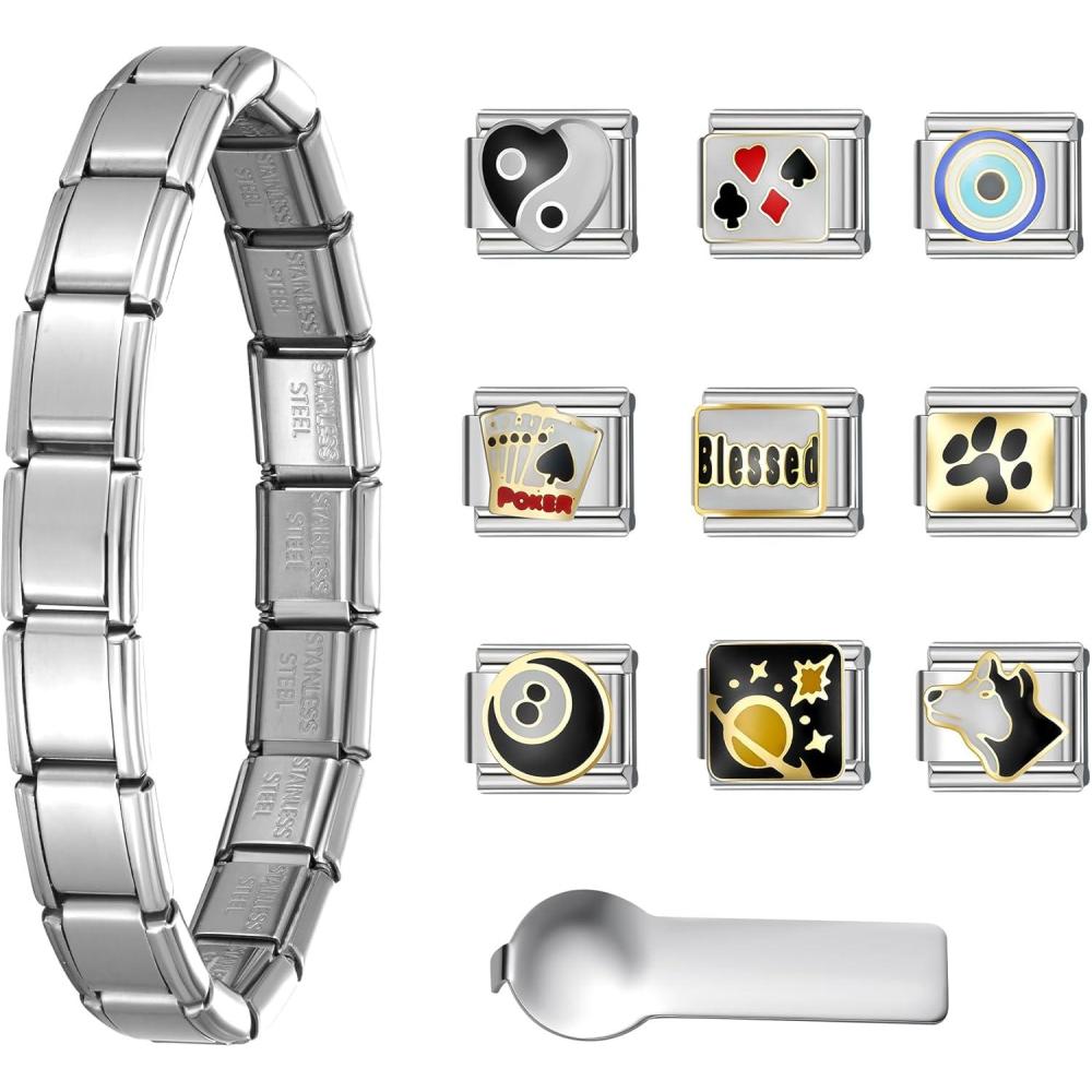 SWEETV Stainless Steel 18 Link Polish Italian Charm Bracelet with 1Pcs Starter Brascelet, 9Pcs/20Pcs Charms and Opening Tools, Classic 9mm Modular Charm, Personalized Jewelry Gift(D-Silver)