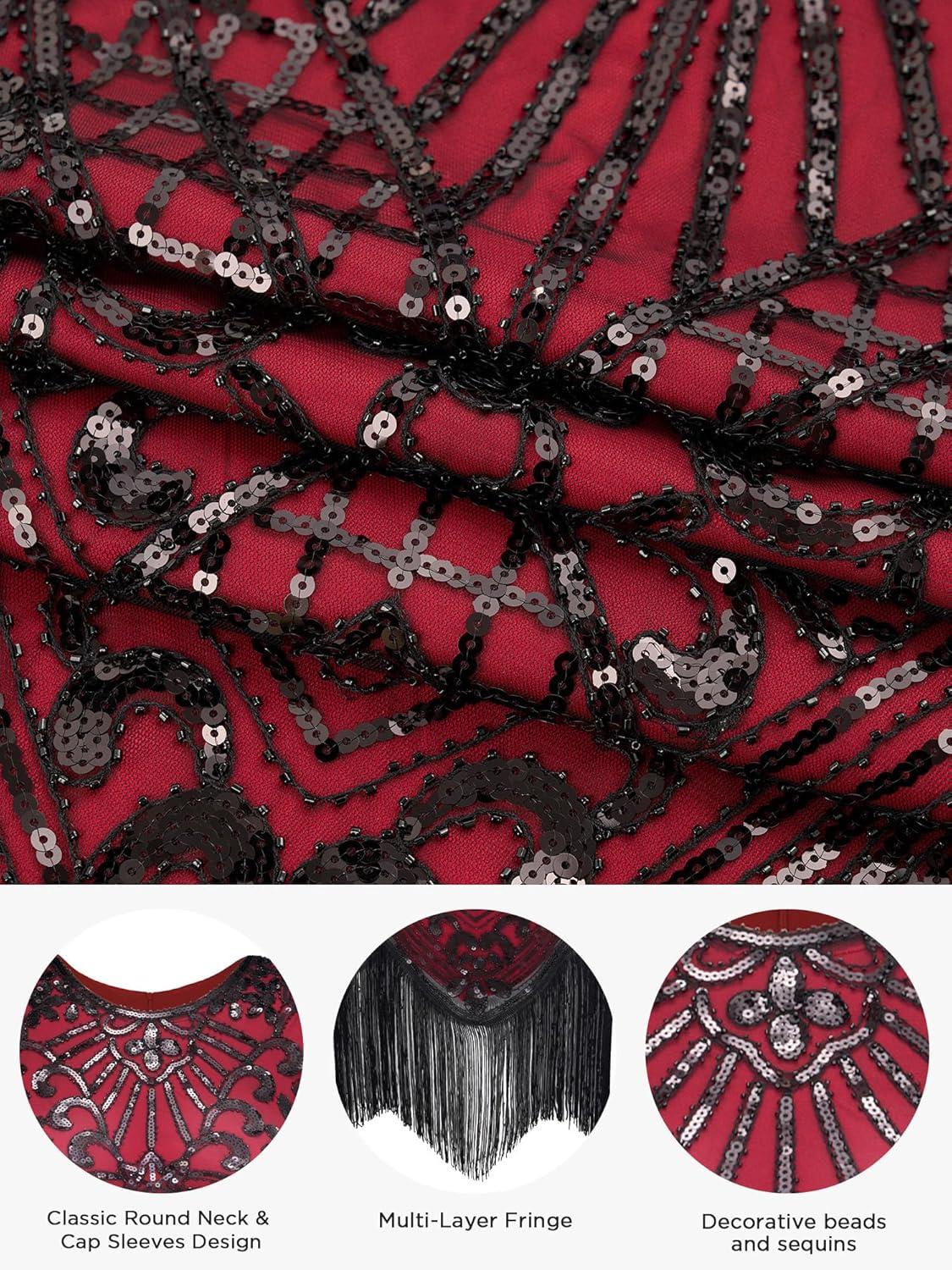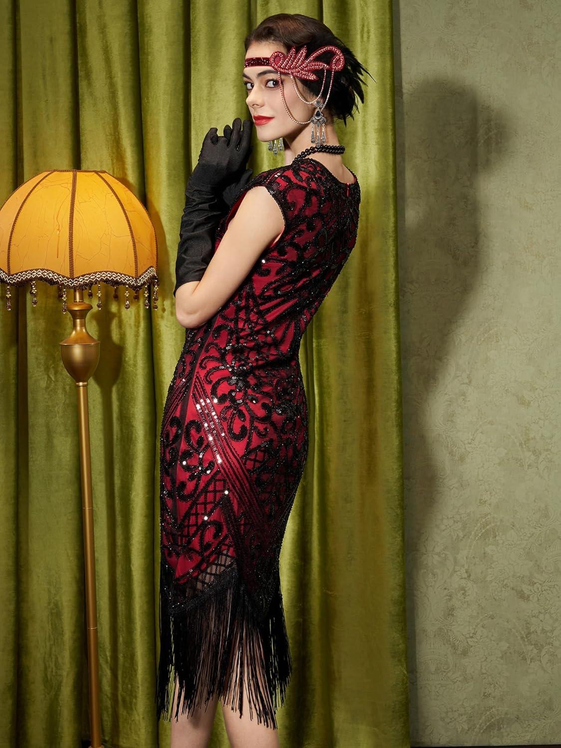 YESSA 1920s Flapper Dresses for Women Great Gatsby Dress Roaring 20s Costumes Sequin Harlem Nights Dress with 20s Accessories(Black-red)