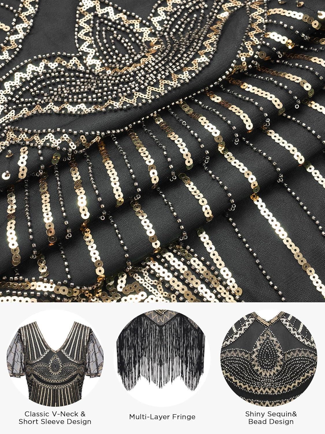 YESSA 1920s Flapper Dresses for Women,Sheer Beaded Sleeves Great Gatsby Dresses Roaring 20s Dresses Costumes with Accessories(Black Gold)